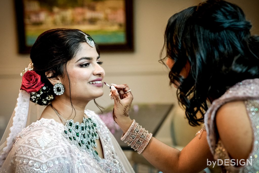 After the wedding ceremony was over, it was soon time for the wedding reception, the couple had a quick outfit change before they joined their loved ones for the reception dinner. The venue was decorated in minimal table settings, and their three-tier green and white gilded wedding cake had its spotlight. Kajol and Sorabh arrived looking ever-so-charming. While Kajol donned a beige and white lehenga and a matching necklace set, Sorabh wore a royal blue suit with a white shirt, beige bow, and a red rose as his boutonniere. The couple had their first dance, toast, and cut their cake. Sorabh also sang a thoughtful song prepared just for this moment. Overall it was a beautiful evening to witness. Needless to say, our Charlotte wedding photographers captured the wedding day with skilled hands. From the Mother’s Day details to the brass idol decor, from the mehendi shots to the art piece with the dupatta, everything was stunning and captured beautifully!
