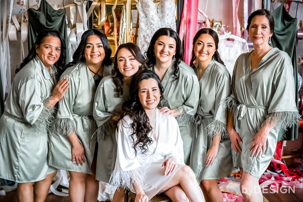 Close-up shots revealed the intricate sage green laser-cut wedding invitations adorned with exquisite calligraphy, reflecting the couple’s refined taste. Nearby, elegant bridal shoes with delicate bow details sat alongside beautifully crafted wedding rings, creating a vignette of anticipation and love. The bridesmaids, dressed in sage green robes, surrounded Ashley, who donned a pristine white robe, as they prepared for the day. Custom wedding cufflinks featuring photos of loved ones and various monogrammed wedding ideas added layers of personal significance to the decor.